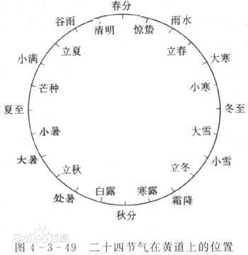 现行的“二十四节气”来自于三百多年前订立的“定气法”,是通过观察太阳周年运动,认知一年中时令、气候、物候等方面变化规律所形成的知识体系。它将太阳周年运动轨迹划分为24等份,分别相应于太阳在黄道上每运动15°所到达的一定位置,每一等份为一个“节气”。二十四节气,它代表着地球在公转轨道上,二十四个不同的位置。而每个节气,都表示着气候、物候、时候,这“三候”的不同变化。春雨惊春清谷天,夏满芒夏暑相连。秋处露秋寒霜降,冬雪雪冬小大寒。”这首中国人熟知的“节气歌”,暗含了二十四节气的先后顺序。地球绕太阳运行的轨道古人命名为“黄道”,也称“日道”,将黄道等比例分成24份,之间相隔15° ,就形成了24个节气。24个节气其实就是24个时令点,每月2个。它是根据天地运行规律来确定四季循环的起点与终点划分出来的,二十四节气的开始日期,与国际通用的公历几乎一致,最多相差一两天,这也正是因为节气和公历一样,都是按照地球一年绕太阳公转一周作为依据。二十四节气与地球环绕太阳的周期运动有关,其年月日全由太阳视运动决定,与太阴月相无关。但它又与通常的阳历(如公历)不同,后者月长由人为规定而与天象无涉,所以它是有中国特色的阳历。