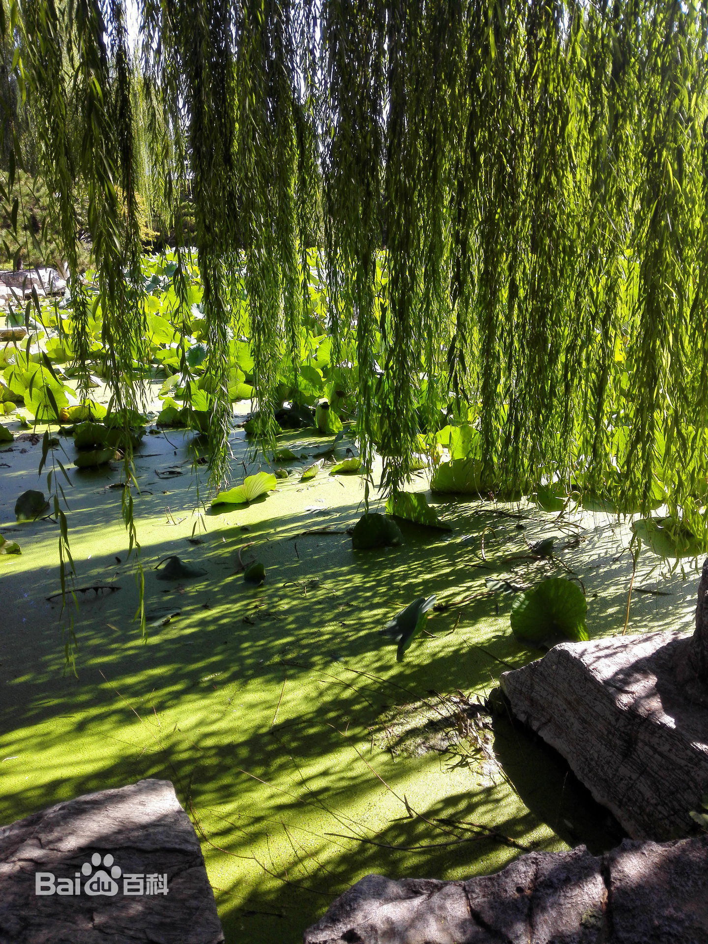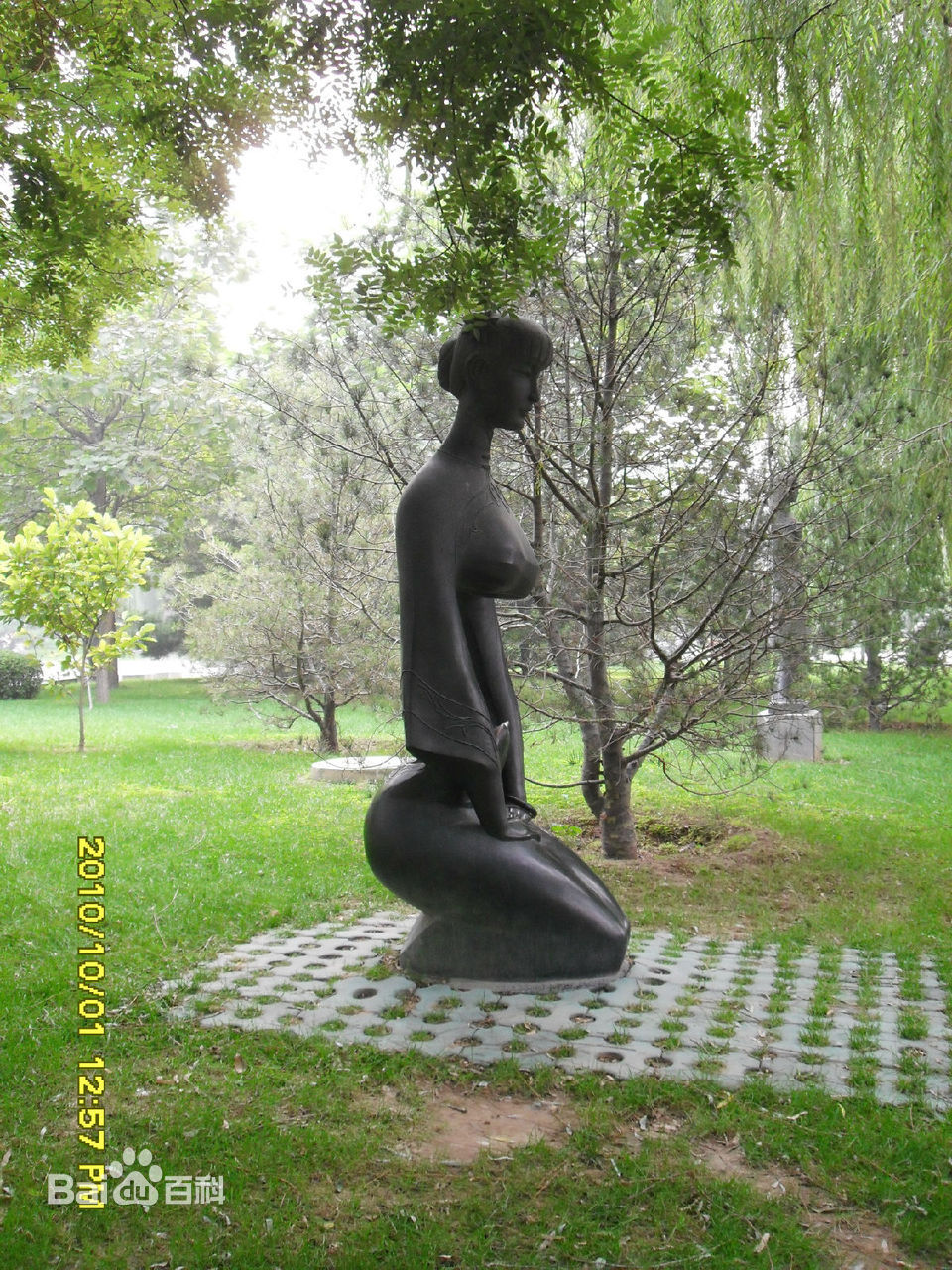 水景雕塑区以公园正门处的大汉白玉透雕为起点,分距南北的两座石桥,将五千平方米的水面分成三部分。置身三面环水、柳荫如烟的小丘之上,水景尽收眼底。湖的中部是绿顶白沿、弧线流畅的圆形水榭和活动广场。这座典雅的建筑与北岸的山石叠水及向东曼延的几座山峰形成环抱之势。湖中,《牧童》悠依牛背,口吹横笛尽情唱晚;湖畔,一尊汉白玉《浴女》石雕亭亭玉立,以湖水作镜,梳理着长长秀发,雕塑的艺术美与环境的自然美融合在一起,诗情画意,画意盎然。